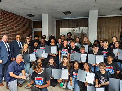 Posted June 15, 2023Mayor Jimmy Davis presented a proclamation to the members of the championship-winning Bayonne High School Marching Band. The group posed on both the City Hall balcony and in front of the City Hall ground floor. The band placed 1st at all six Regular Season US Bands Competitions and became US Bands Group 1A NJ State Champions in 2022. The Bayonne High School Marching Band also won awards for Best Visual, Best Overall Effect, and Best Percussion at the State Championships. The BHS Marching Band was also designated the US Bands Group 1A National Championship Runner-Ups. The BHS Marching Ban also won awards for Best Overall Effect and Best Percussion. In addition to the student musicians, among those in the photos are Samantha Hitchell-Herskowitz (Director of Bands, Choirs, and The Bee’s Knees), Mayor Davis, and City Council Members At-Large Juan Perez and Loyad Booker. Various graduating seniors will be continuing their studies in the performing arts in college at Montclair State University and Temple University.