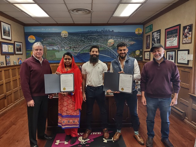 Posted January 23, 2024Muslim Heritage Month: Bayonne Mayor Jimmy Davis issued a proclamation for January 2024 as Muslim Heritage Month. The City of Bayonne joined other New Jersey municipalities that have issued proclamations and resolutions honoring the contributions of the local Muslim community. Pictured left to right: Mayor Jimmy Davis, Arjumand Juweria, Islam Elgarhi, Ali Hassan, and Sam Awad.