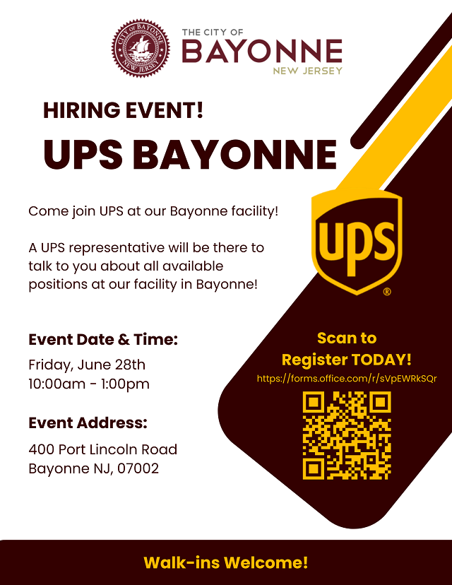 UPS Bayonne Hiring Event Posted June 18, 2024 Friday, June 28th 10:00am - 1:00pm 400 Port Lincoln Road