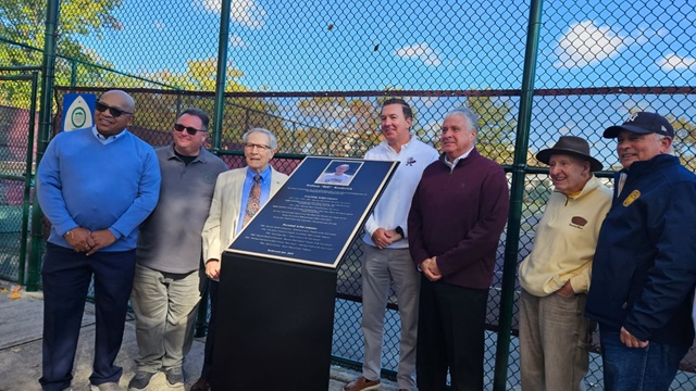 On October 24, the County of Hudson held a ceremony at Gregg-Bayonne County Park to dedicate the park’s tennis courts to Bill Broderick. A member of the Hudson County Sports Hall of Fame, Broderick served as a tennis coach for both boys’ and girls’ high school teams and was a physical education teacher for the Bayonne Board of Education. He initiated the girls’ high school tennis program in Bayonne and led them to four Hudson County Championships, with an overall record of 201-50. He led boys’ tennis teams to twenty-one county championships and a sixty-nine-match winning streak against county competition. Coach Broderick guided the only Hudson County boys’ team that ever won thirty-two matches in a single season. He was named Teacher of the Year at Robinson School in 1990 and at Bayonne High School in 2000.