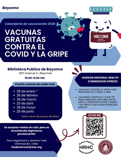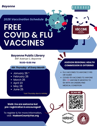 Posted January 09, 2026The City of Bayonne, in partnership with the Hudson Regional Health Commission (HRHC), is offering free COVID-19 and flu vaccinations at the Bayonne Public Library throughout the first half of 2026.