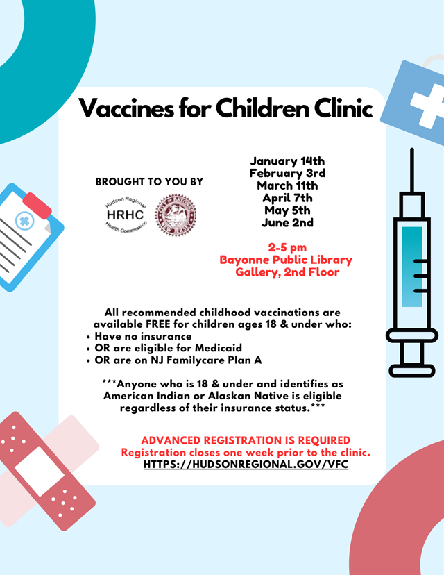 Posted January 09, 2026The Hudson Regional Health Commission, in partnership with the City of Bayonne, is offering a series of free childhood vaccination clinics for eligible children through the first half of 2026.