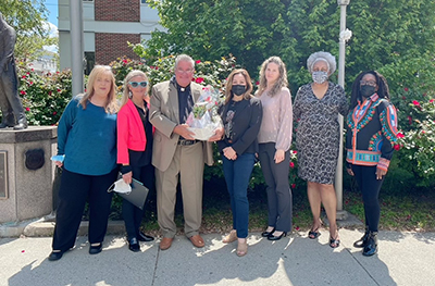 Bayonne Office on Aging staff with the Bayonne and Hudson County Senior of the Year 2021: Staff members of the Bayonne Office On Aging congratulated Pastor Gary Grindeland on being named Senior of the Year for both Bayonne and Hudson County. Pictured from left to right: Anna Gonzalez, Annie Grindeland (sister of the honoree), Pastor Gary Grindeland, Teresa Troglio, Meghan Luzzi, Office On Aging Executive Director Joyce Person-Perkins, and Dawn Herring.