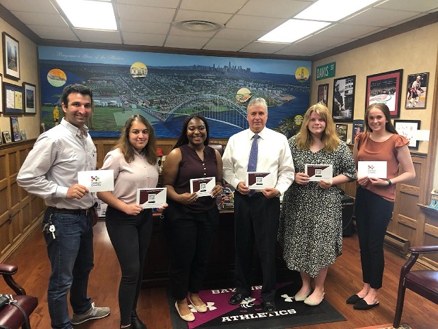 Pictured from left to right: First Ward Council Member and Social Studies teacher Neil Carroll III, Alyssa Rozario, Kiara Opoku, Mayor Davis, Maggie Caley, and Kelly Sweeney. The Social Studies Director for the Bayonne Board of Education is Dan Ward, who wrote an introduction to the booklet.